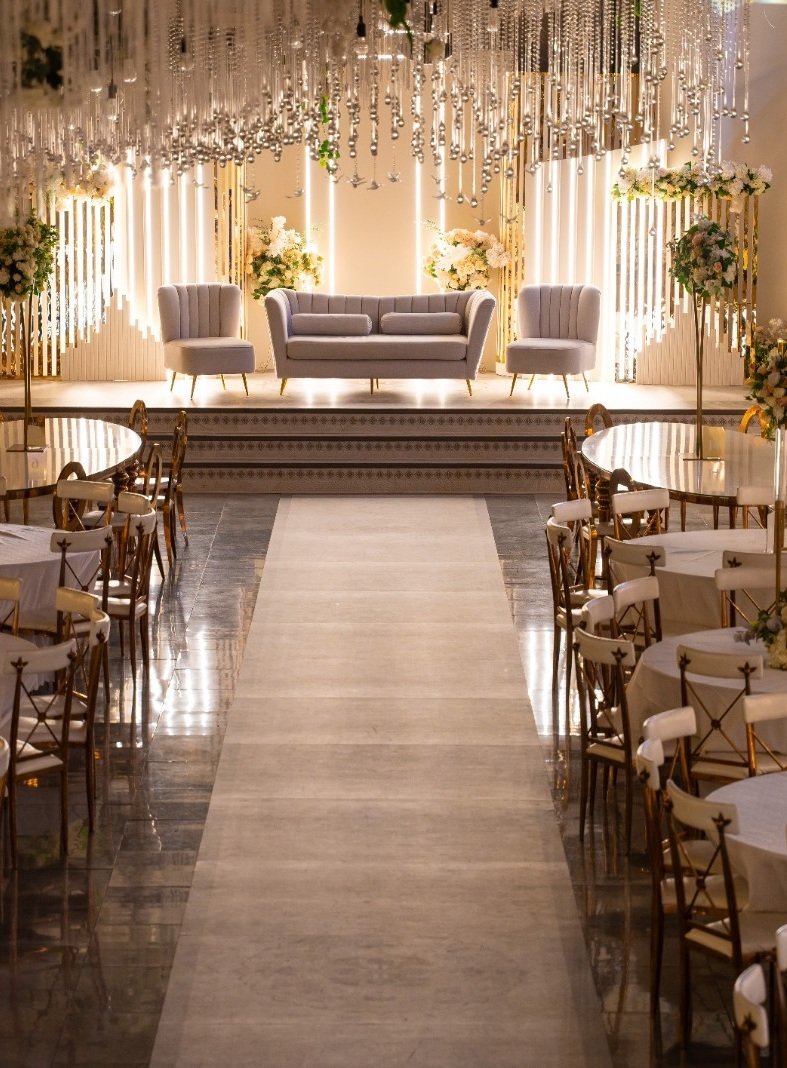 Dedicated Mehndi space with stage for the bride, dance floor, full halal catering, and mood lighting.