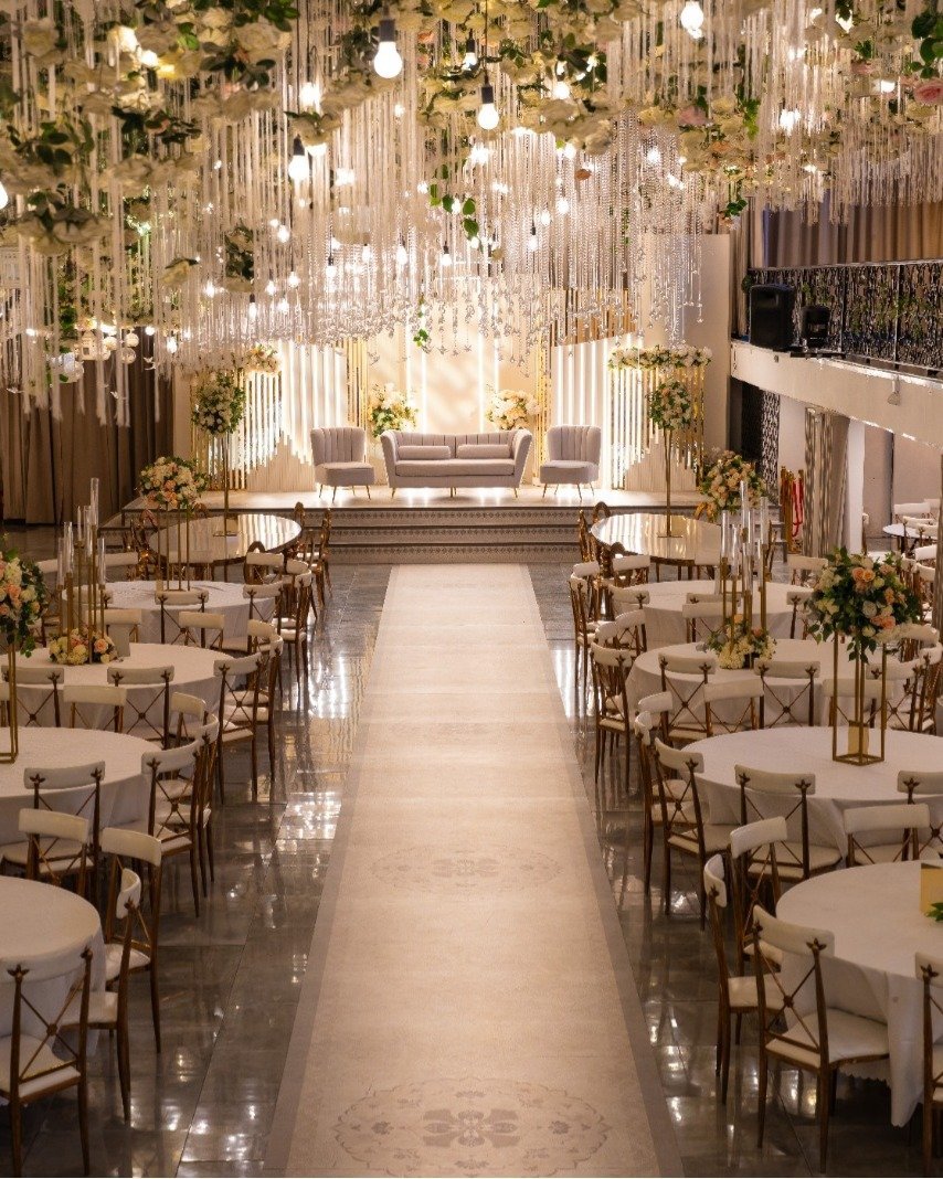 The White Abbey Ballroom's all-inclusive grand reception hall welcomes up to 500 guests. The hall includes a central dance floor beneath the bird-nest ceiling, a dedicated stage, fully controllable mood lighting, marquee drapes, uniformed waiters, prayer facilities, wudhu facilities, and 140 free on-site parking spaces with dedicated attendants.