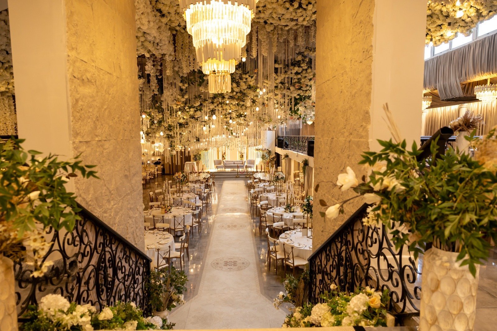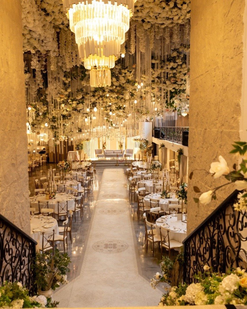 The White Abbey Ballroom’s dance floor sits at the precise centre of the reception hall, directly beneath the bird-nest ceiling. It is the most photographed spot in the venue. The first dance at The White Abbey Ballroom is framed by 5,000 flowers, 200 lanterns, and 150 crystal birds overhead.